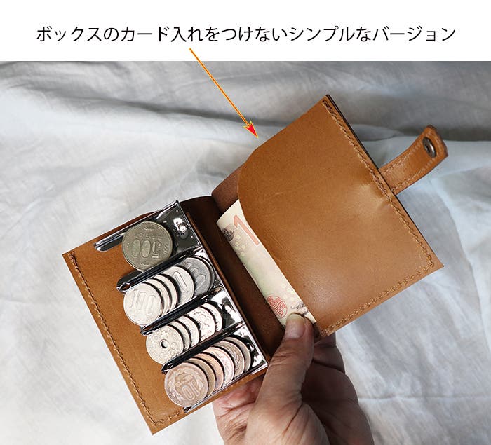 ボックスのカード入れをつけないコインキャッチャーとマネークリップ、シンプルなカード入れがついた財布