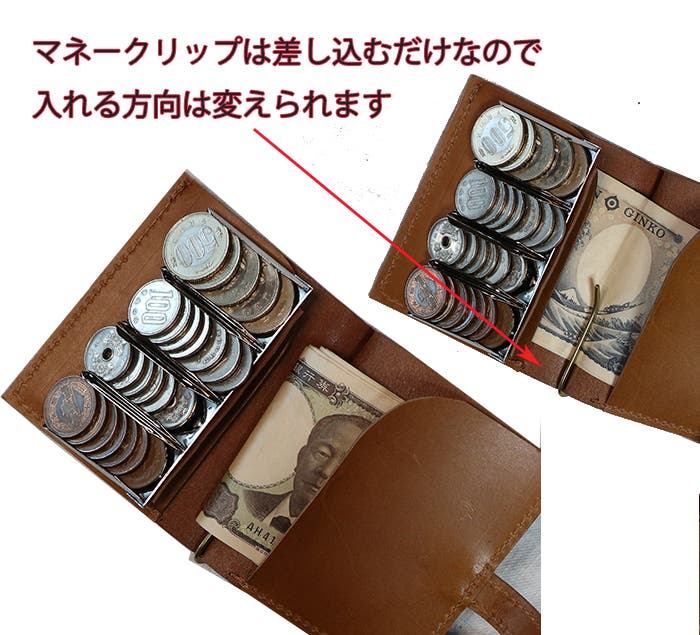 ◯お札はマネークリップに挟んで収納します。マネークリップの方向は上下の向きをマネークリップの差し込み向きを変えられます。
