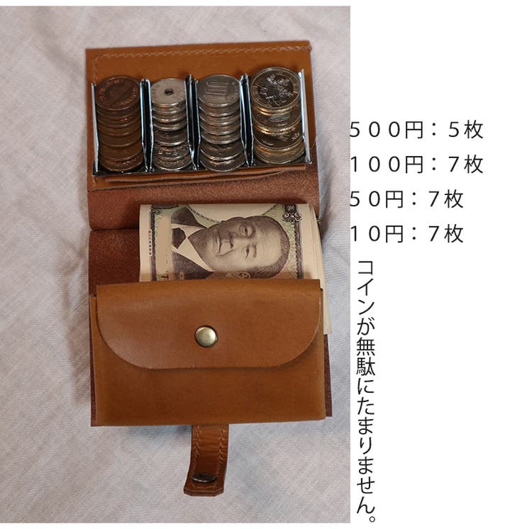 コインは500円 100円 50円 10円がスライド式に収納できるので余分な小銭がたまりにくいです
