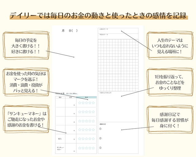 - ちょっと得をしたお金『サンキューマネー』を記入することで、毎日感謝して過ごすことができる!