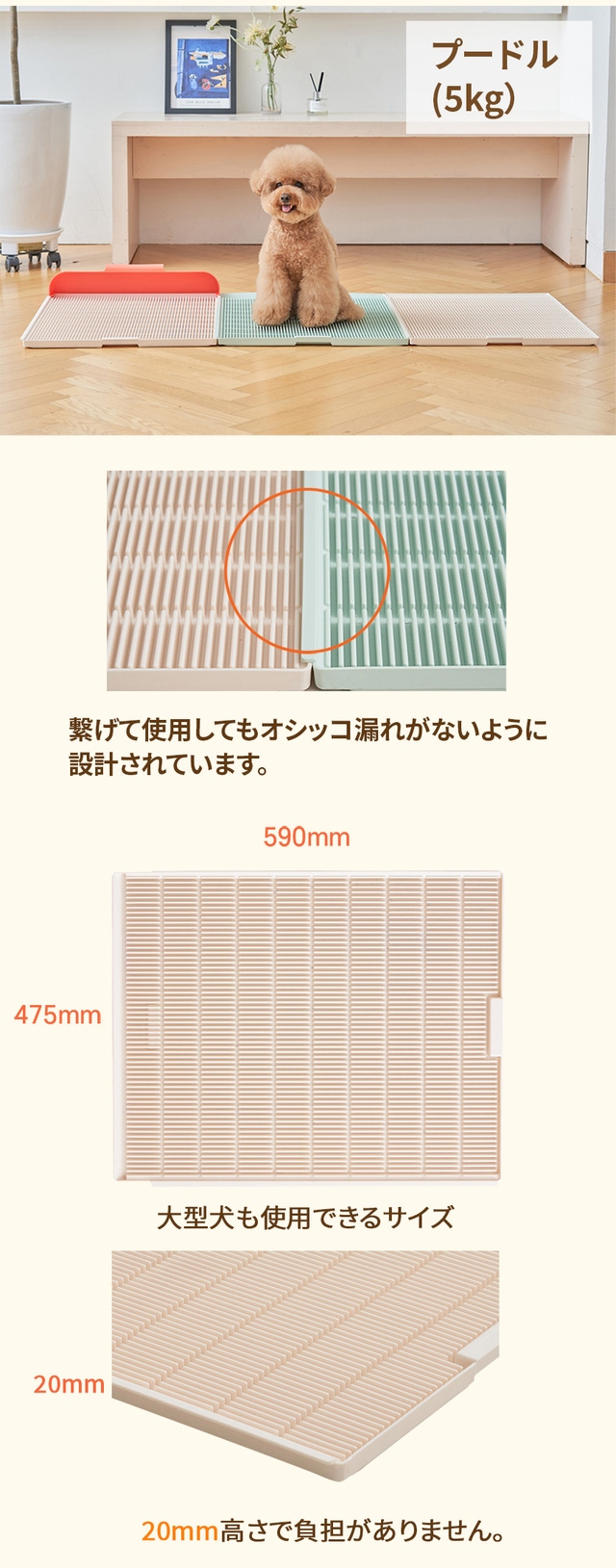 『子犬のおトイレ掃除、とっても大変…』おトイレ掃除は多くの飼い主さんの悩みの種となっているのではないでしょうか。スイング犬用おトイレは、傾けるだけで簡単に処理でき、立体突起が施されており、おしっこをした後も足に付かずさらっとした環境が保てるので衛生的です。大型犬の場合は、複数繋げて使用することも可能です。