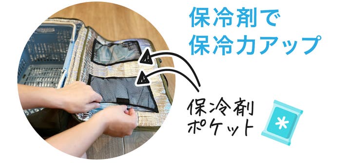 A. 付属しません。市販の保冷剤をご利用ください。上部のメッシュポケットに保冷剤を入れると、冷気が上から全体に回りやすくなります。目安として500g級×1〜2個の使用を推奨(荷物量・外気温で調整)。