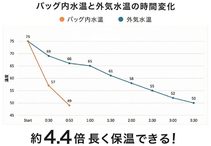 バッグに入れたお湯は、50℃以上を 約3時間40分キープ。
