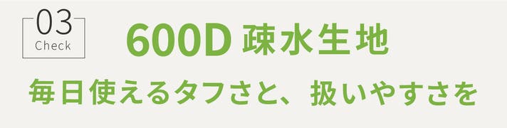 A. 600Dポリエステルは摩耗や型崩れに強く、疎水性のある素材です。