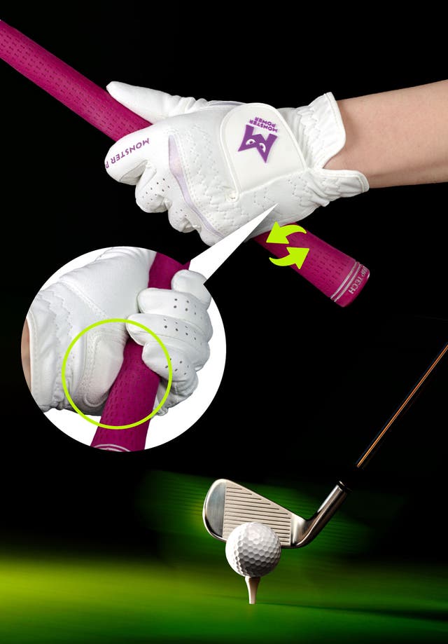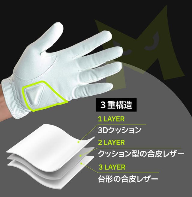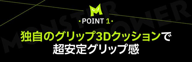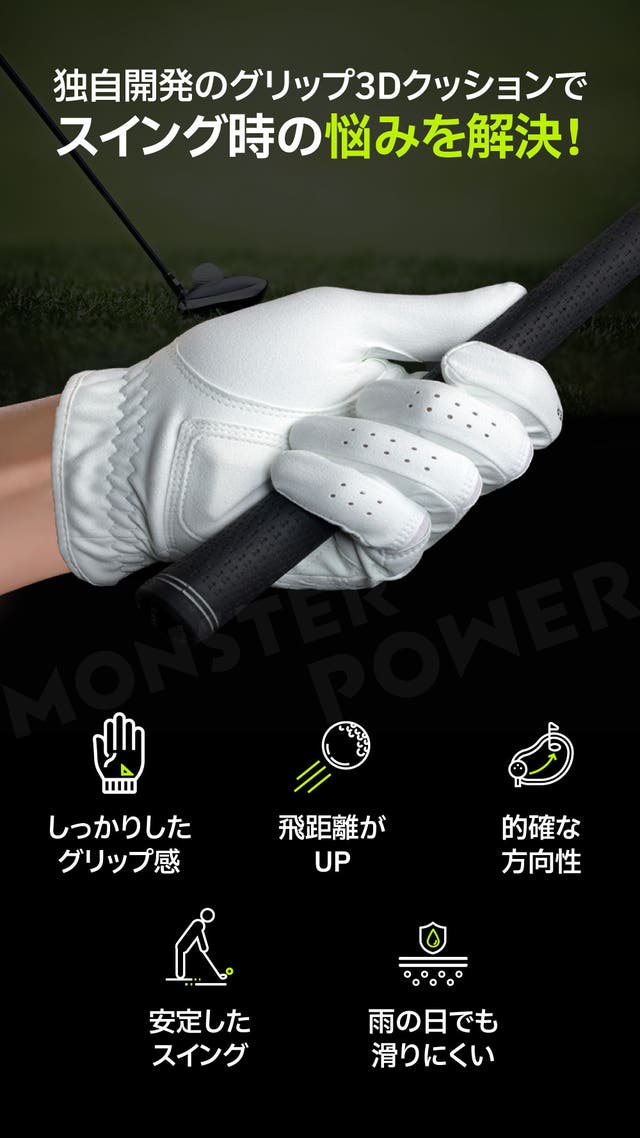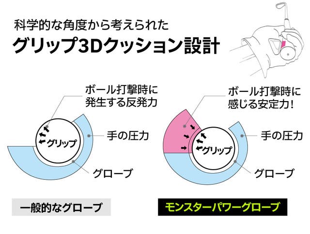 モンスターパワーグローブには独自に開発したグリップ3Dクッションを施し、そこにクラブを持ってくればしっかりとしたグリップが可能です。