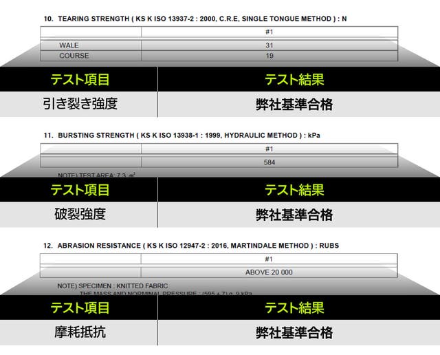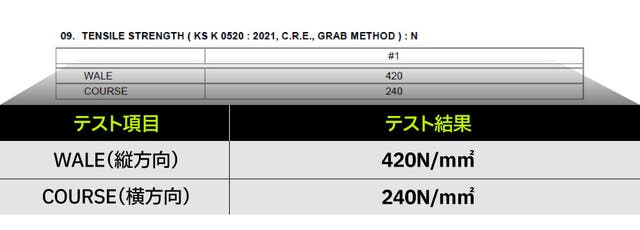 テスト結果からも一般的な衣料品の生地よりも引張強度が高いことが分かります。