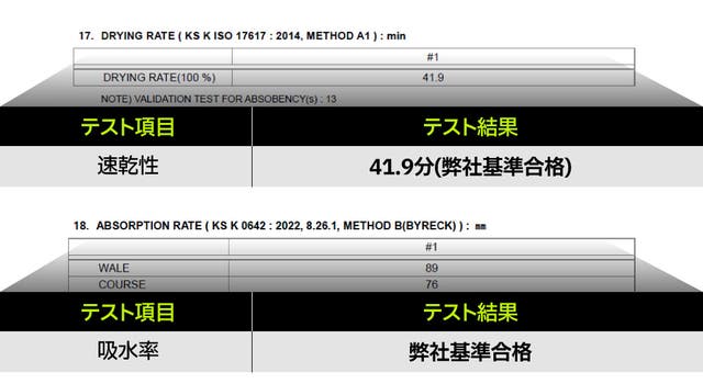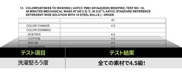 「色の変化の程度(変退色)」と「他の洗濯物への色移りの程度(汚染)」を評価する洗濯堅ろう試験でも4.5級という優れた成績を収めました。