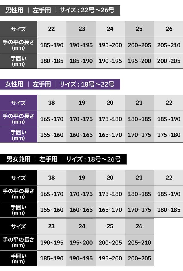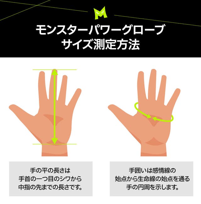 モンスターパワーグローブは男性で22号~26号まで、女性は18号~22号までと豊富なサイズを用意しました。