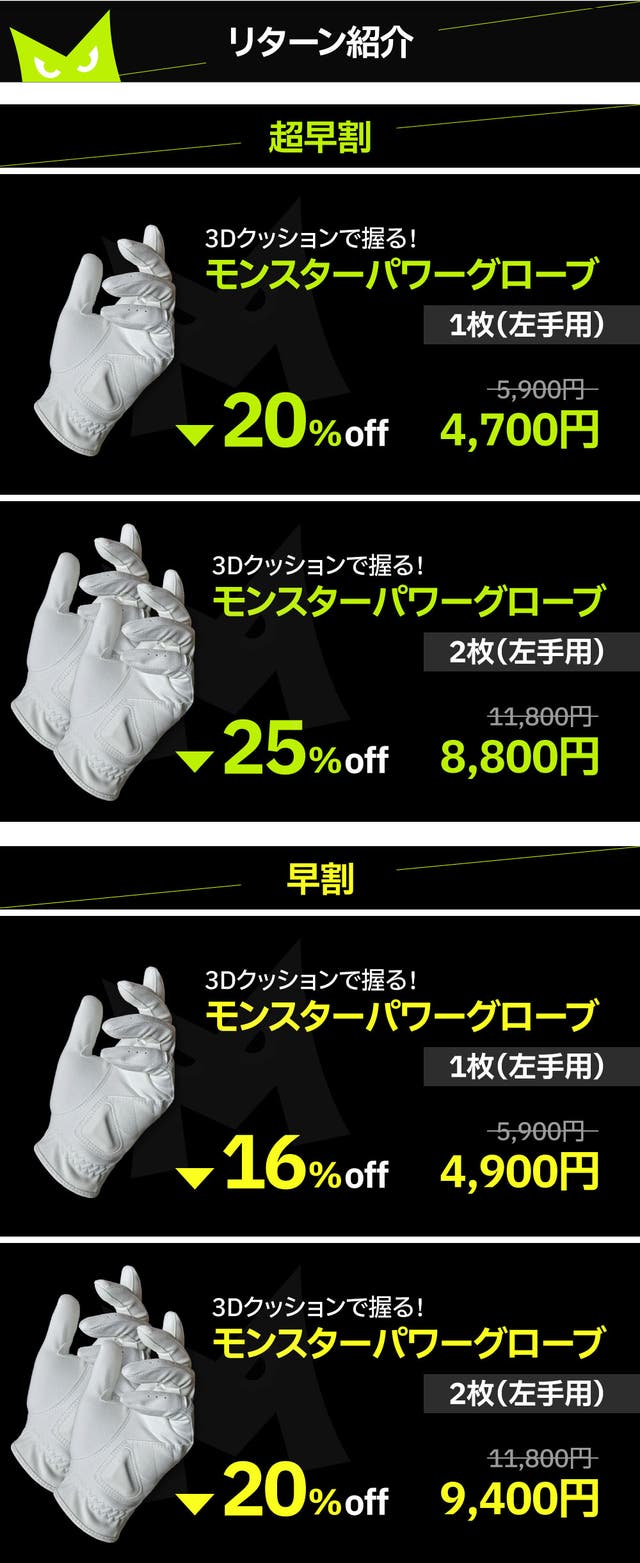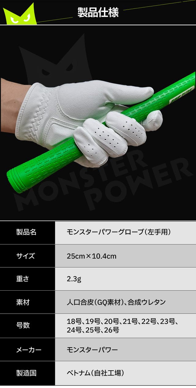 この商品を輸入しようと思った理由:ゴルフを趣味としている友人がたまたま見つけたモンスターパワーグローブ。つけて見ると今までとは違う安定感を感じることができました。多くの悩めるゴルファーにぜひ紹介したい!そういう思いで紹介させていただくことになりました。