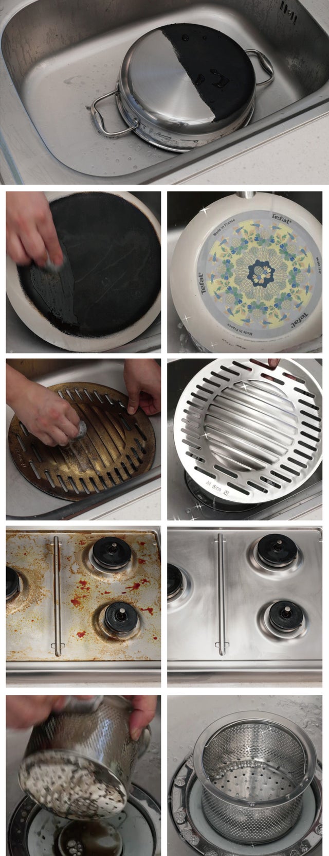 Ⅱ. 洗剤なしで、傷つかず煤落とし・頑固汚れを落とすことができ、焦げた鍋も新品のようになるオールインワン幻のたわし