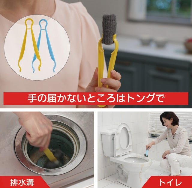 手の届きにくい排水溝や、素手で洗いたくないトイレなどは専用トングで楽々!
