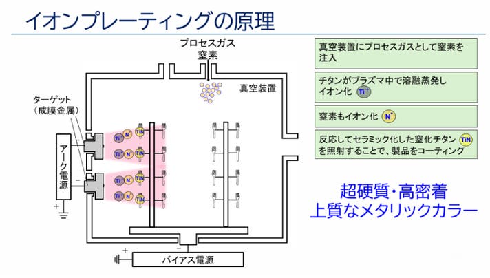 このイオンプレーティングは、高級時計やジュエリー、カメラのレンズコーティングなど、一流ブランドにも採用される技術です。