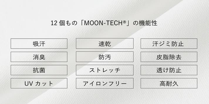 「MOON-TECH®︎」は、JAXA(国立研究開発法人宇宙航空研究開発機構)・東レ共同開発による「宇宙技術」を筆頭に、高レベルな機能性を12種類も搭載した、「過剰なほどの機能性」を持つ先端素材です。