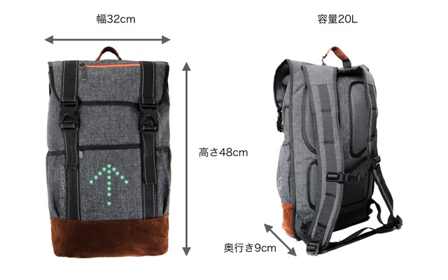昼夜を問わず、誰の目にも止まりやすいよう、大きなLED表示であなたの行き先をバックパックに表示します。バックパックに収納するLEDとハンドル脇に取り付けるリモコンによって操作をします。