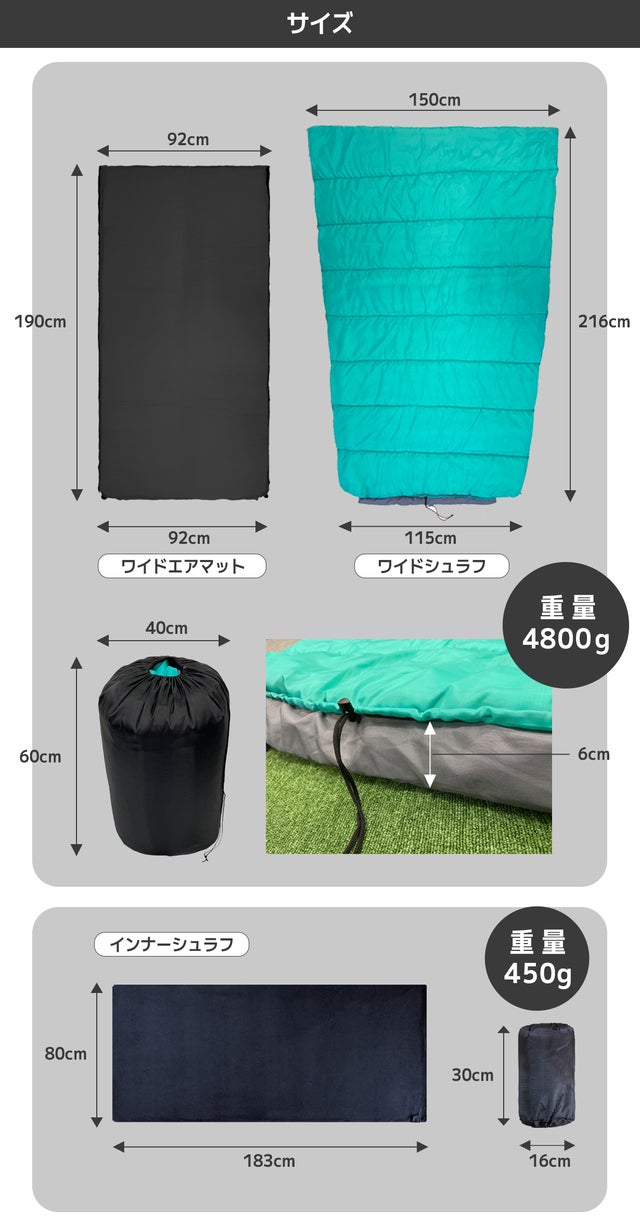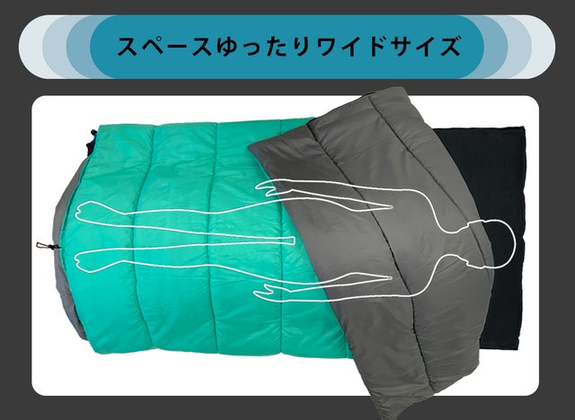 ゆったりと眠れるワイドサイズなので、寒ければインナーシュラフや毛布を足すこともラクラク。持ち運びも一つで済むので忘れ物の心配がありません。