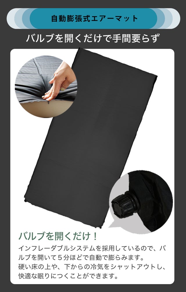設置は広げて自動膨張式エアーマットのバルブを緩めるだけ!