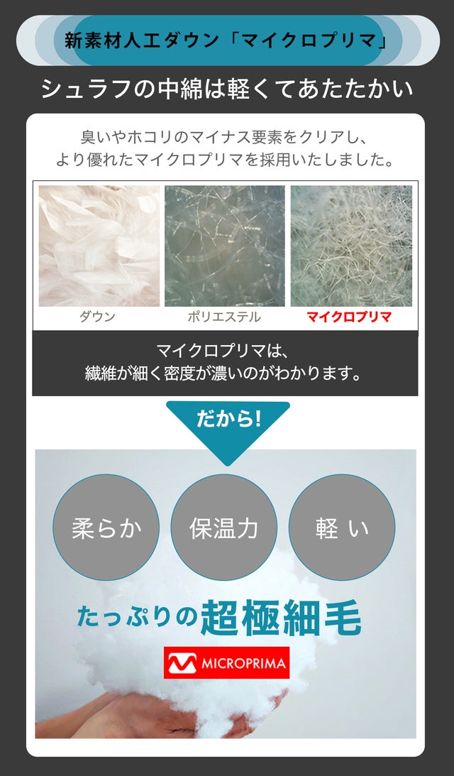 人工ダウン「マイクロプリマ」で暖かくワイドのゆったりしたシュラフを合わせて、ふかふかの寝心地で快適な睡眠環境をサポートします。