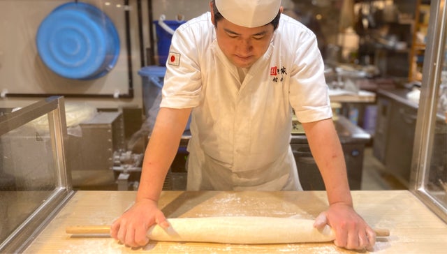 手応え十分といった感じの店主森田。「全粒粉がしっかりなじんでるね。打っていてしっかり反発があるし、茹でたらモチ感が出そうだね」