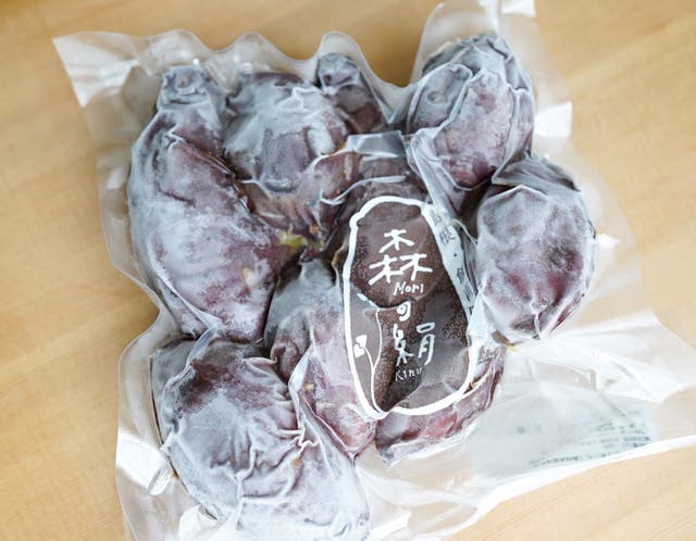 よく見かける「紅あずま」や「鳴門金時」はホクホク系なんですが、「森の絹」は「絹」の食感をイメージして、水分と蜜を含むしっとりと、そしてなめらか系のおいもです。