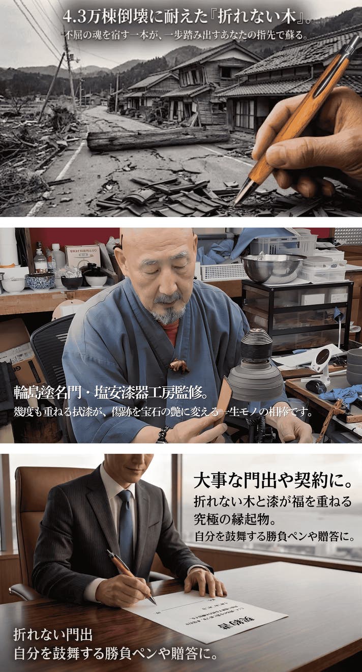 これは単なる筆記具ではなく、能登の再生を願う私たちの祈りと、応援してくださる皆様との絆の象徴です。石川の地から世界へ。若き職人の挑戦を、ぜひ応援してください。