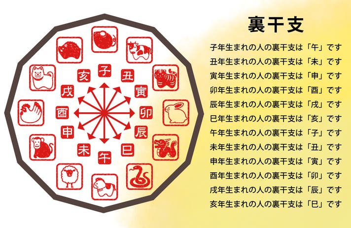 裏干支(「向かい干支」や「逆さ干支」とも)とは、自分の干支から数えて6つ目、つまり正反対(下図参照)に位置する干支を指します。