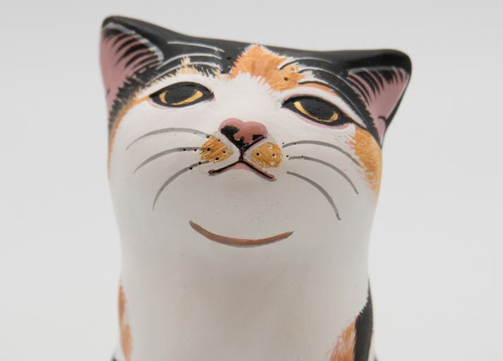 エサシトモコは、東京藝術大学卒業後、同校大学院保存修復科、文化庁国内研修を経て活躍するアーティスト、エサシトモコ。その代表作であるカオデカクンは猫をモデルに素焼き(テラコッタ)で制作する造型作品で、顔や毛並みはすべて手筆で描き込まれます。