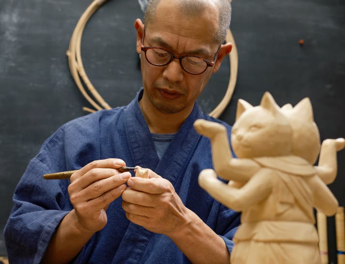 威厳を放ちながらもどこか愛らしい達磨と、味わいのある鏡餅の原型制作は、猫の姿をした仏様「猫仏」や「猫buddha」、「幸せを授ける十二支木彫りコレクション」、また最近SNSでバズった特注制作品「阿弥陀柴犬」で話題沸騰中の酒井豪仏師が手掛けています。