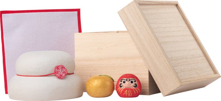 鏡開きが終われば、鏡餅一式を台座の三宝型桐箱に収納して保管できる利便性を持ち合わせており、毎年繰り返しお使い頂けます。