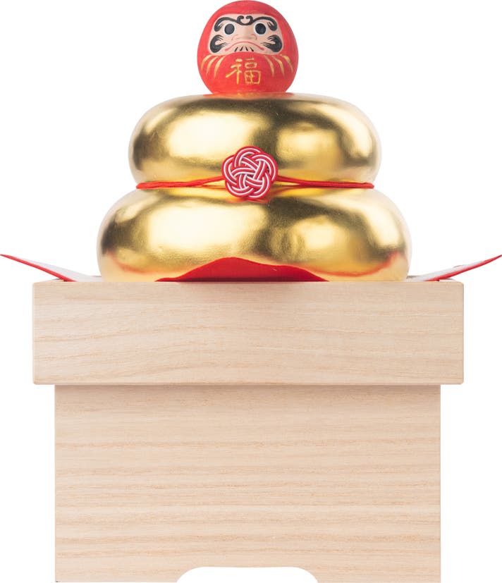 サイズ・重量(約):達磨/高さ44×幅48×奥行47 mm・25g、鏡餅/高さ90×幅148×奥行148mm・458g、橙/高さ43×幅55×奥行55mm・40g、 三宝型飾り台/高さ134×幅190×奥行190mm・313g、飾り付け時(達磨使用)/高さ264×幅190×奥行190mm・ 総重量:808g、達磨用敷板/高さ5×幅50×奥行50mm・15g●材質:達磨・鏡餅・橙/桧、達磨用台座/ブナ、三宝型飾り台/桐、水引飾り/紙・ゴム・レーヨン、四方紅/ポリエステル ●生産国:達磨・鏡餅・橙・台座/中国、金箔仕上げ・三宝型飾り台・水引飾り・四方紅・アッセンブル/日本 ●製品内容:達磨、鏡餅、橙、三宝型飾り台、達磨用台座、水引飾り、四方紅、御祈祷証明書