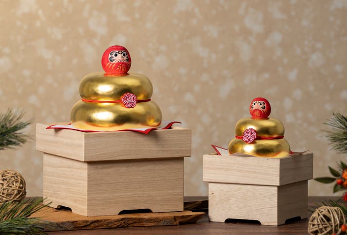 少林山達磨寺開眼『達磨 木彫り鏡餅』は、鏡餅部分に金箔を貼った豪華仕様もご用意。職人が丁寧に金箔を貼り込んだ特別な逸品です。