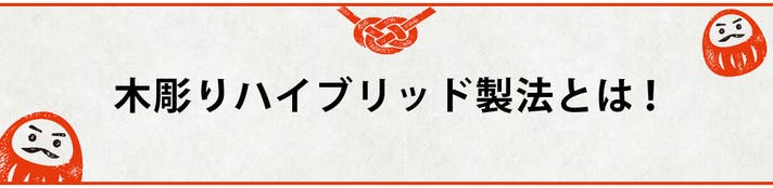 『達磨 木彫り鏡餅』、『木彫りの縁起だるま』、『達磨大師坐禅像』は、人と機械のハイブリッド製法を導入することで高い品質を維持した均質な量産を実現しています。