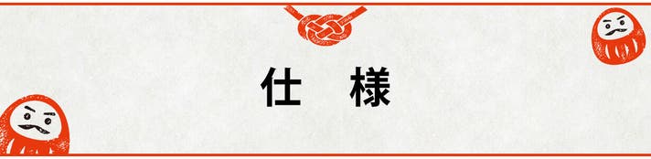 サイズ・重量(約):達磨/高さ33×幅35×奥行34 mm・10g、鏡餅/高さ66×幅100mm×奥行100mm・175g、橙/高さ31×幅39×奥行39mm・12g、 三宝型飾り台/高さ108×幅135×奥行135mm・158g、飾り付け時(達磨使用)/高さ201×幅135×奥行135mm・ 総重量:344g、達磨用敷板/高さ5×幅50×奥行50mm・15g●材質:達磨・鏡餅・橙/桧、達磨用敷板/ブナ、三宝型飾り台/桐、水引飾り/紙・ゴム・レーヨン、四方紅/紙 ●生産国:達磨・鏡餅・橙・台座/中国、三宝型飾り台・水引飾り・四方紅・アッセンブル/日本 ●製品内容:達磨、鏡餅、橙、三宝型飾り台、達磨用敷板、水引飾り、四方紅、御祈祷証明書