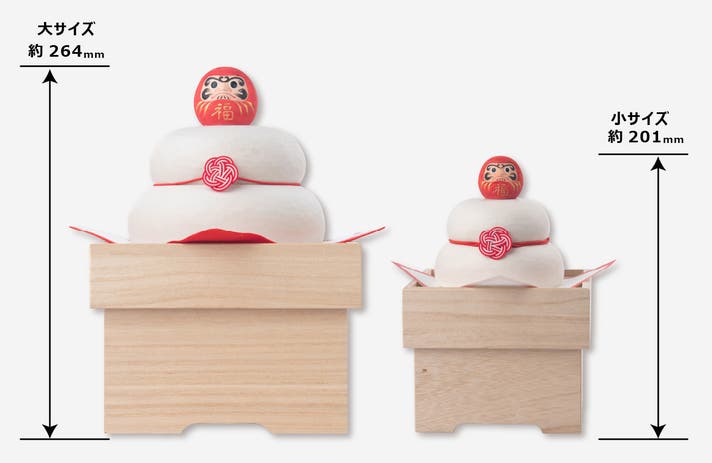 サイズ・重量(約):達磨/高さ44×幅48×奥行47 mm・25g、鏡餅/高さ90×幅148×奥行148mm・458g、橙/高さ43×幅55×奥行55mm・40g、 三宝型飾り台/高さ134×幅190×奥行190mm・313g、飾り付け時(達磨使用)/高さ264×幅190×奥行190mm・ 総重量:808g、達磨用敷板/高さ5×幅50×奥行50mm・15g●材質:達磨・鏡餅・橙/桧、達磨用敷板/ブナ、三宝型飾り台/桐、水引飾り/紙・ゴム・レーヨン、四方紅/ポリエステル ●生産国:達磨・鏡餅・橙・台座/中国、三宝型飾り台・水引飾り・四方紅・アッセンブル/日本 ●製品内容:達磨、鏡餅、橙、三宝型飾り台、達磨用敷板、水引飾り、四方紅、御祈祷証明書