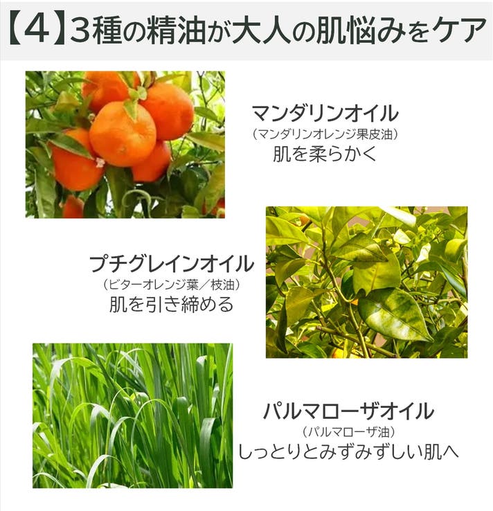 **アロエベラ液汁、ホホバ種子油、グリセリン、ペンチレングリコール、セラミドNP、ビターオレンジ葉/枝油、パルマローザ油、マンダリンオレンジ果皮油、バクチオール、フランスカイガンショウ樹皮エキス、トリ(カプリル酸/カプリン酸)グリセリル、フィトステロールズ、カプリリルグリコール、ヒドロキシプロピルビスパルミタミドMEA