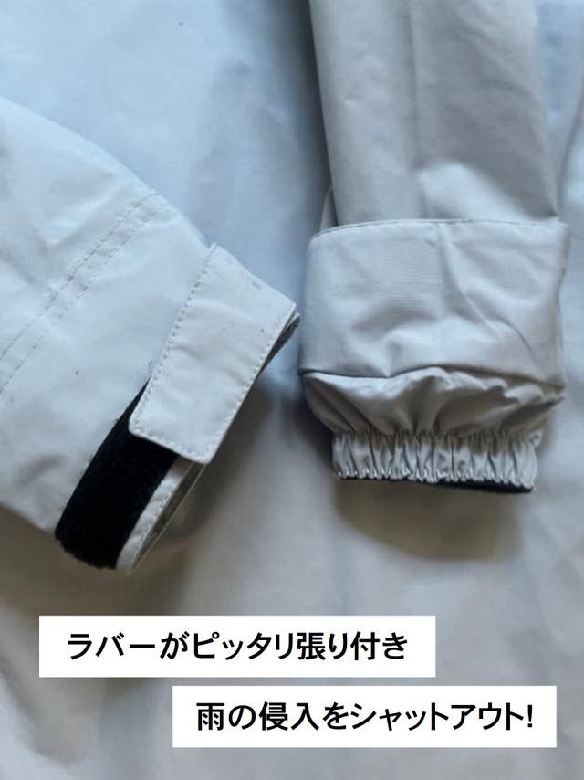 マジックテープ付きでしっかりと袖口を閉めることが可能。滑り止めラバーを含め3重構造で袖口からの雨の侵入を遮断します。