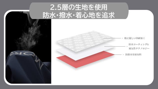 MORRに使用されている生地素材は水分を生地に付着させない高水準の撥水性生地です。