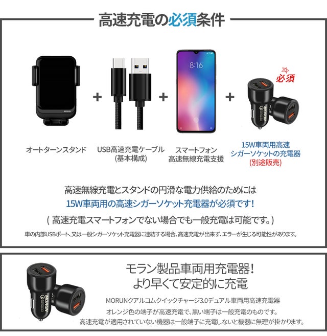 ・車両用の高速無線充電スタンド+高速シガーソケットの充電器 1SET