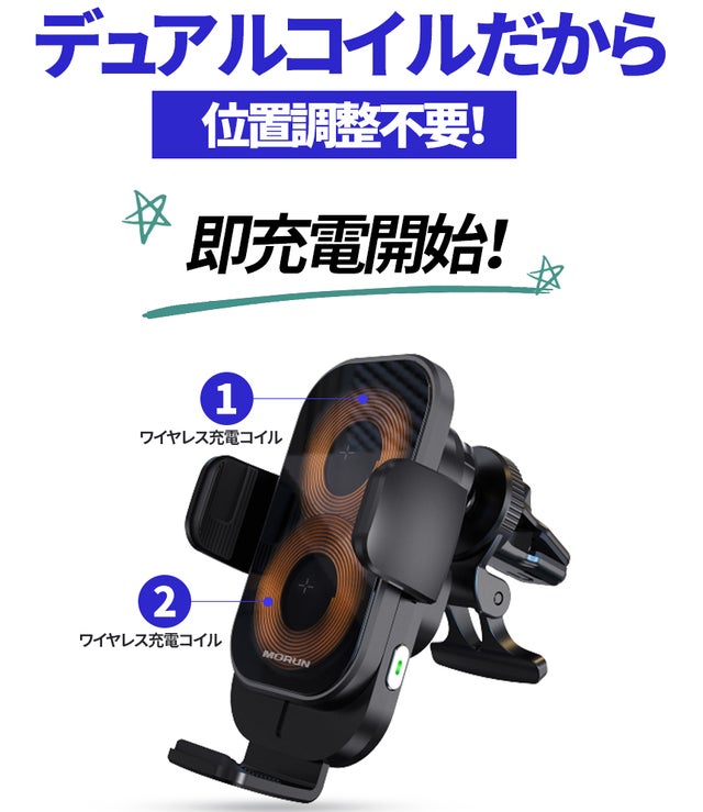 - 充電コイルが1つではなく2つの高速ワイヤレス充電スタンド!様々なサイズのスマホも位置調整不要