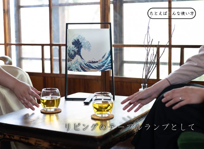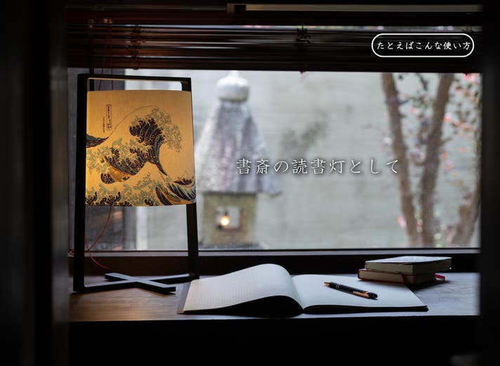 その灯りは和紙を通して柔らかく拡散し、北斎の名作を光とともに映し出します。静かな空間に格調を添えるだけでなく、ひとつのアートオブジェとして存在感を放ちます。