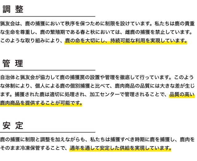 しかしながら、一般消費者の認知度はまだまだ低く、鹿肉は大切にされておらず、結果的に価格が転嫁されていません。「MOSHIKA(モシカ)」は、鹿肉の可能性を広げる商品や流通を創造し、サステナブルな社会の実現に貢献することを目指しています。