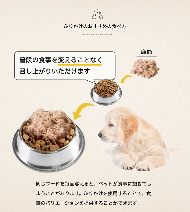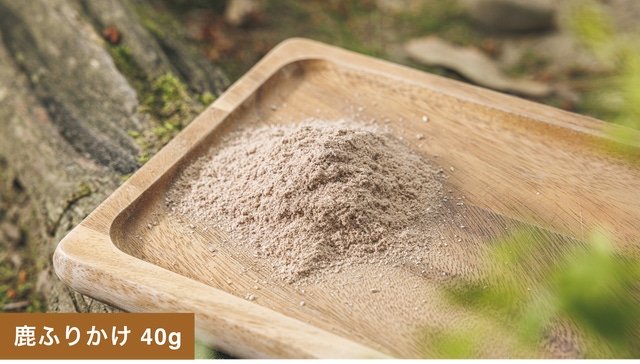 鹿肉と骨をバランスよくブレンドし、粉末にしたふりかけは、栄養バランスの取れた優れたおやつです。ドッグフードに少量をふりかけると、食いつきが良くなります。また、老犬や歯の弱い犬には、ジャーキーよりもふりかけがおすすめです。