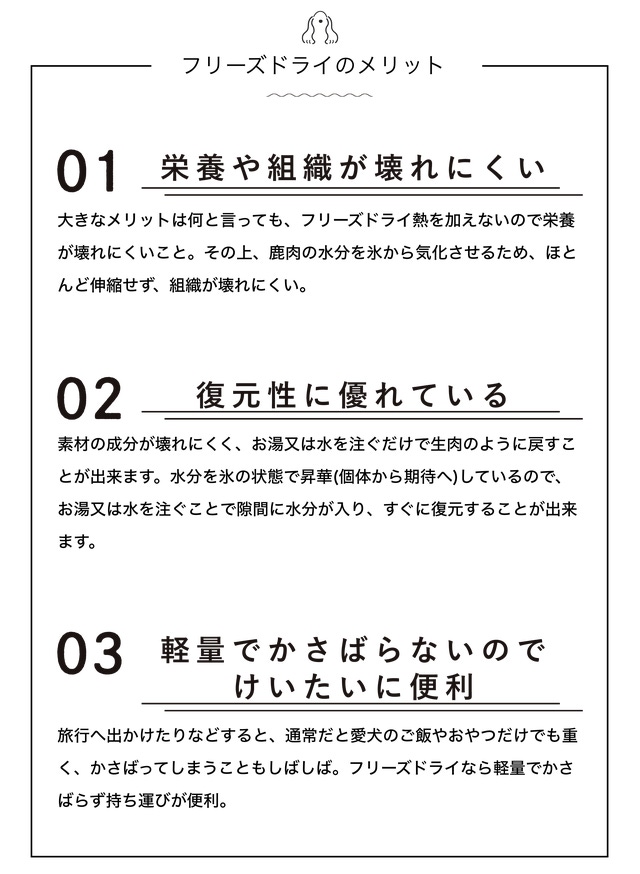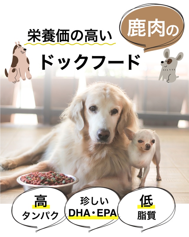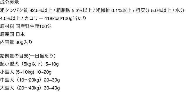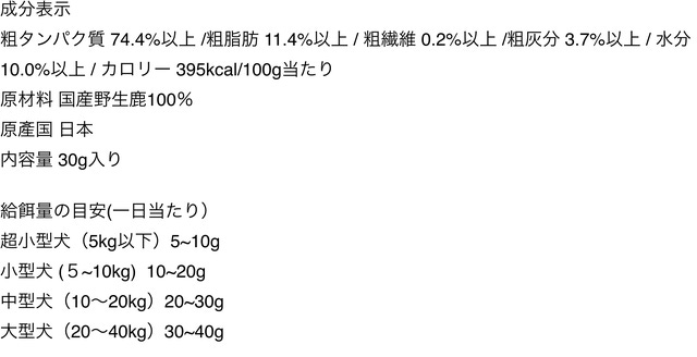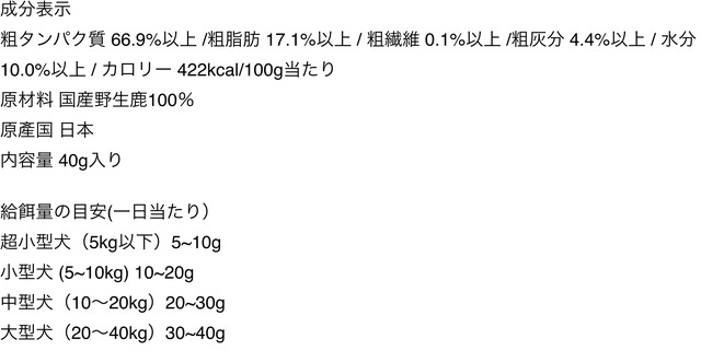 - 栄養価の高い鹿肉をペットの食べやすいサイズで提供します。