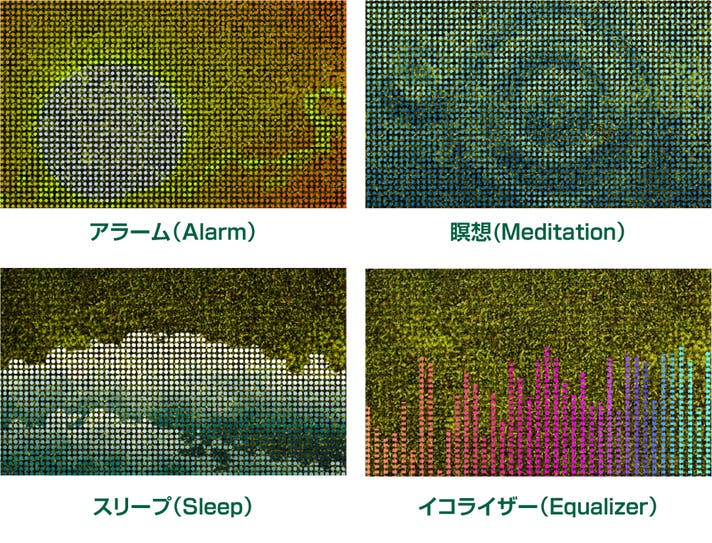 ムードライティングは、照明用ディスプレイと連動してご使用いただけます。MODEボタンを押して「Clock/Meditation/Sleep」3種類のモードを切り替え、