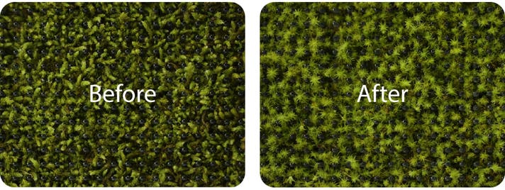 根を持たない植物なので、土壌管理や複雑な環境条件を気にする必要がありません。苔は健康を保つために、定期的に軽く水や霧吹きをするだけで十分に育ちます。また、驚くほどの回復力を持ち、最大6か月間水分がなくても耐えることができます。再び水を与えるとすぐに元気を取り戻し、光合成を再開して生き生きとした姿を見せてくれます。