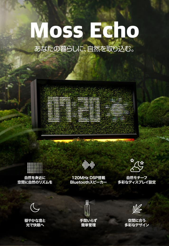 Moss Echoは、自然の「音」「光」「生命力」をテクノロジーで表現した、都市の中のリラクゼーションデバイスです。
