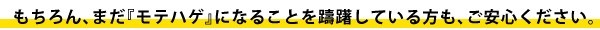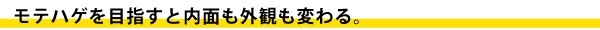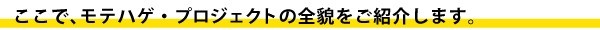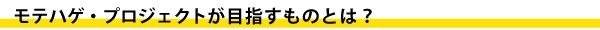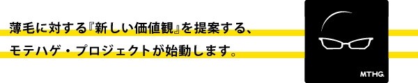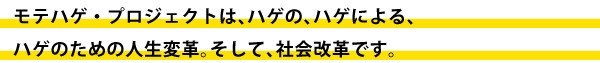 現在、薄毛で悩んでいる男性に一日も早くその日を実現してもらうことこそが、モテハゲ・プロジェクト発足の原点です。そして、本プロジェクトのミッションは、自信を持って格好良く生きるポジティブな『モテハゲ』を多数輩出することなのです。