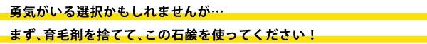 上述した通り、巨大な薄毛市場があるという事は、薄毛の方々にそれだけお金を使わせる仕組みがあるという事です。その根底にあるのが、『ハゲはカッコ悪い』というネガティブなメッセージです。そのつくられた価値観から脱し、そのメッセージによって使い続けている育毛剤の代わりに、この石鹸を手にしてつくられた古い価値観を洗い流してしまうことが、モテハゲの第一歩となります。