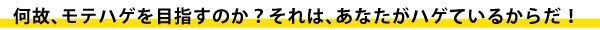 わたしたちが使う『モテハゲ』というコンセプトは、ただ、『ハゲがモテるようになる』という事ではなく、『ハゲは恥ずかしいという作られた価値観を根底から覆す』パラダイムシフトを起こし、『ハゲを肯定するポジティブな変化』を起こすことです。そして、現在国内でも年間4,300憶円に達する薄毛市場のお金を、薄毛男性が格好良く生きるための自己投資に使うことを奨励し、日本のハゲを救い、日本から世界を明るく照らそう!というスケールのでかい世直しを行う!それが、『モテハゲ・プロジェクト』なのです。
