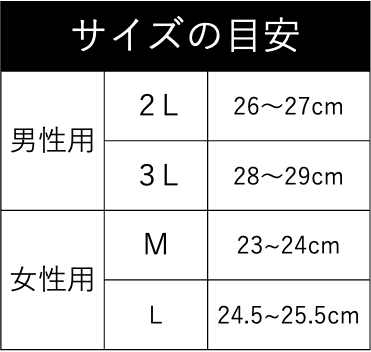 男性の2Lが26.0cmから27.0cm、3Lが28.0cmから29.0cm、女性のMが23.0cmから24.0cm、Lが24.5cmから25.5cmです。