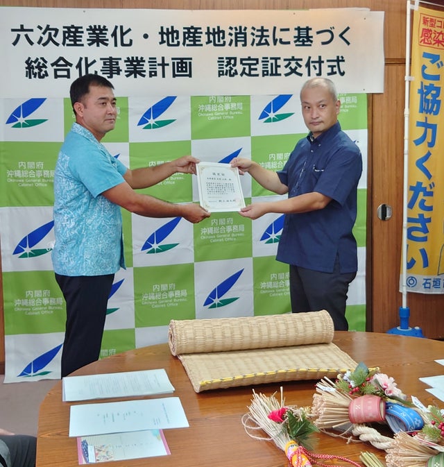 沖縄総合事務局による、新事業スタートを支援する「六次産業化・地産地消に基づく総合化事業計画」で、サンダルなどの開発や、島内の就労支援施設とともに製品製作をしていることなどが評価され、本原畳店が認定されました。